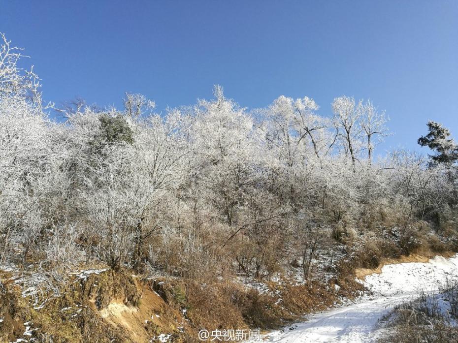 受較強冷空氣影響,秦嶺腹地涼風埡山頂,出現大面積霧凇景觀。玉樹瓊枝,晶瑩剔透,讓涼風埡山頂變得像童話世界一般,美不勝收。 央視記者王志杰 圖片來源:央視新聞微博