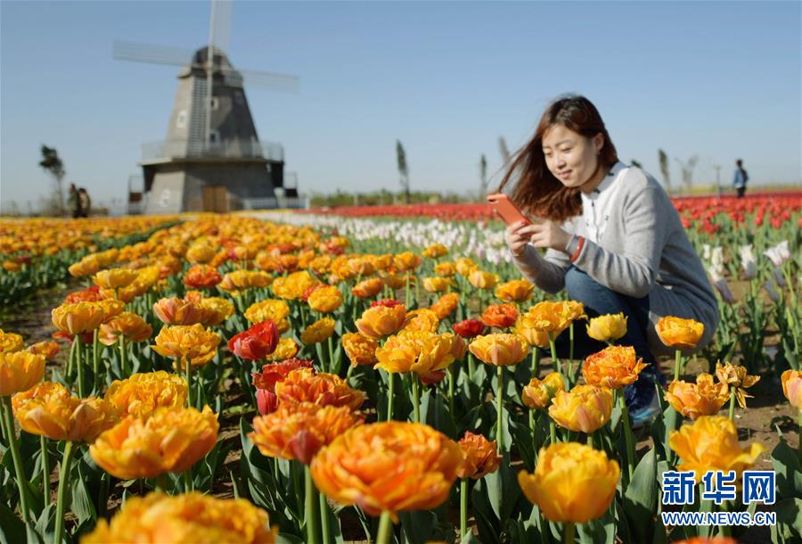 4月19日,游客在衡水湖森林公園欣賞郁金香。近日,河北衡水市冀州區(qū)衡水湖森林公園的48個(gè)品種、近百萬(wàn)株郁金香競(jìng)相開放,吸引游客前來(lái)觀賞游玩。(新華社記者 王曉 攝)