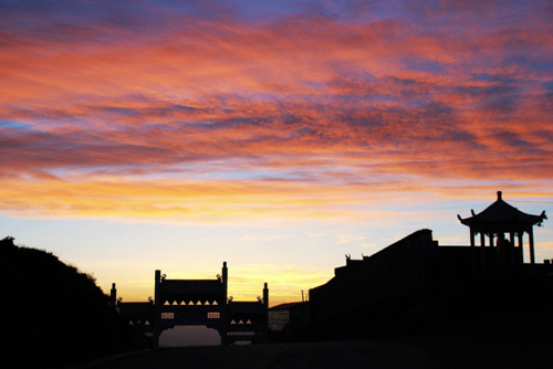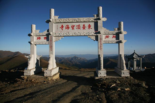 望海峰的盛景在于東觀日出。由于東面再無大山阻擋,所以人的目力可東眺非常遙遠的地方。峰頂曾建有望海樓,專門為觀景而建??上昃靡褮?,1985年重建,為望海寺,內(nèi)供聰明文殊。有史籍記載日出之壯麗景象:“每當(dāng)蒸云寢壑之隙,爽氣澄秋之際,于日出扶桑之時,可望紅日十倍于車輪,紅輪之下,隱隱水光閃爍,若波若鏡,瑰麗非凡。1977年8月,趙樸初先生登東臺觀日出后乘興填詞《五臺雜詠·調(diào)寄憶江南》,形象描繪了東臺日出之勝景: