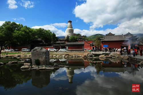 臺懷鎮(zhèn)鎮(zhèn)北有一小峰,人稱靈鷲峰,亦名菩薩頂。所以稱之為靈鷲峰,是因?yàn)樗牡乩硇蝿蓊H似古印度摩揭陀國王舍城東北部釋迦牟尼佛說法的靈鷲峰故名。據(jù)佛教史籍記載,東漢時期,我國佛教最初的傳播人攝摩騰和竺法蘭來到臺懷鎮(zhèn),見今菩薩頂?shù)男蝿蓊H似印度的靈鷲峰,因而命名之。所以也稱靈鷲峰為菩薩頂,佛教徒傳說文殊菩薩曾在峰頂顯靈和說法。