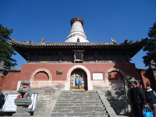 塔全稱為釋迦牟尼舍利塔,俗稱大白塔。塔身撥地而起凌空高聳,在五臺山群寺簇擁之下頗為壯觀,人們把它做為五臺山的標志。此塔通高七十五點三米,環(huán)周八十三點三米。塔基為正方形,塔身狀如藻瓶,粗細相間,方圓搭配,造型優(yōu)美。塔頂蓋銅板八塊成圓形,按乾、坎、艮、震、巽、離、坤、兌等八卦地位安置。塔頂中裝銅頂一枚,高約五米,覆盤二十一米多,飾有垂檐三十六塊,長兩米多;每塊垂檐底端掛風鐘三個,連同塔腰風鐘在內(nèi),全塔共有二百五十二個。風歡鈴動,叮鐺作響。