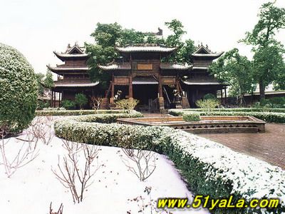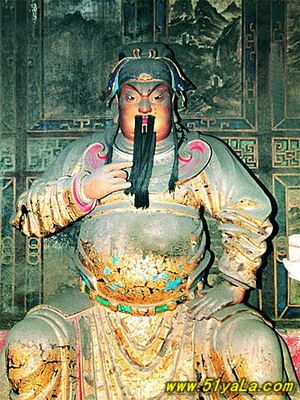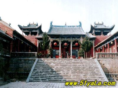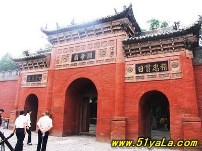 前行有午門.是一座面闊五間,單檐廡殿頂、石雕回廊的廳式建筑。周圍有石欄桿,欄板正反兩面浮雕各類圖案、人物144幅,洋洋大觀,頗有童趣。廳內南有周倉、廖化畫像,軒昂威武。北面左右兩側,彩繪著關羽戎馬一生的主要經歷,起于桃園三結義,止于水淹七軍,只是沒有走麥城這個情節(jié),在全國關廟壁畫中都按此進行,據(jù)說這是因忌諱關羽自高自大而被殺,終于造成蜀國的覆滅而隱去的。穿過午門,經“山海鐘靈”坊、御書樓,便是關帝廟主體建筑崇寧殿。
