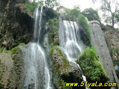 娘子關瀑布,是澤發(fā)水的源頭,人稱水簾洞,山坡谷中泉眼累累,形成懸泉。瀑布由多股泉水匯流而成,沿懸崖峭壁傾瀉而下,懸空如白練掛在石壁前,形成高達十幾丈高的飛流?!昂Q邸笔亲畲蟮娜郏瓭L,激起層層浪花,響聲震耳。瀑布旁有“趵突泉”突突噴涌,并有諸多小“趵突泉”相映襯。一股股水流噴吐冒出,浪花紛飛,日夜不息,常年涌流,給娘子關風光增色不少。