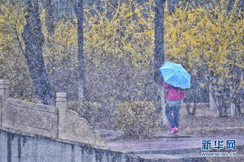 4月3日,市民在延慶區(qū)一個公園中賞雪。當日,華北中部地區(qū)氣溫驟降,位于燕山山脈腳下的北京市延慶區(qū)降下一場春雪。 新華社記者 李欣 攝