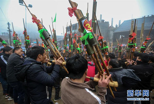 1月14日,人們在廣西融水苗族自治縣紅水鄉(xiāng)舉行的蘆笙節(jié)上賽蘆笙。新華社記者 陳君清 攝