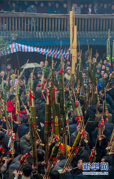 1月14日,人們?cè)趶V西融水苗族自治縣紅水鄉(xiāng)舉行的蘆笙節(jié)上賽蘆笙。新華社記者 陳君清 攝