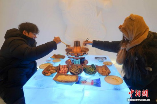 在用雪打造的屋子里,羊肉片、凍豆腐、青菜拼盤等食材已經(jīng)擺好,陸續(xù)有游客前來體驗雪屋火鍋的“冷熱交替”?!巴饷媪阆露龋灾序v的火鍋很刺激?!北本┯慰蛣⒉┛≌f。