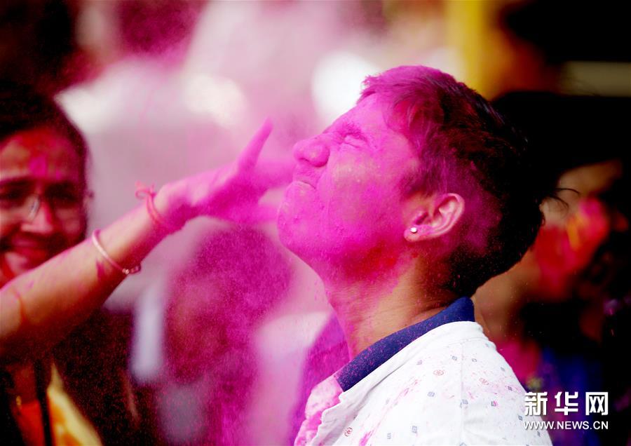 胡里節(jié)也叫“灑紅節(jié)”,人們?cè)谧约耗樕虾蜕砩贤可项伭?,還向別人拋撒五顏六色的顏料和粉末,迎接春天的到來。新華社發(fā)(吳昂 攝)