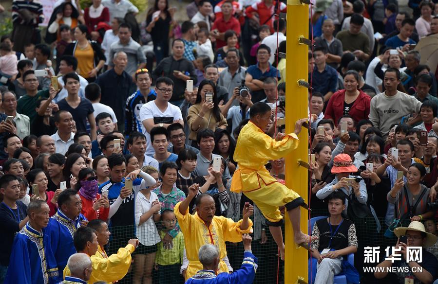 農(nóng)歷十月十五前后,福建西部武平縣各山村陸續(xù)進入農(nóng)閑時節(jié)。按照當?shù)仫L(fēng)俗,不同村子各自擇日舉辦民間活動,其中較有代表性的就是“上刀山”絕技?!吧系渡健苯^技在閩西山村流傳已有數(shù)百年歷史,表演者需光腳順著磨得鋒利閃亮的36把鋼刀,攀登至8米高的杉木柱子頂部,接受長者祝福,祈求風(fēng)調(diào)雨順、五谷豐登。新華社記者 宋為偉 攝