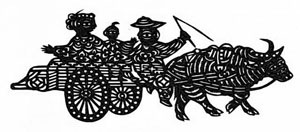 《姥爺送外甥》是靜樂民間老剪紙藝術家辛芙英早年的一幅剪紙,也是靜樂剪紙最具代表性的一幅名作,現(xiàn)收藏于中國美術館。這幅剪紙表現(xiàn)了閨女住完娘家之后,由父親(外甥的姥爺)趕著牛車送閨女和外甥回家的場面。剪紙人物造型生動形象,樂趣橫生,令人百看不厭。