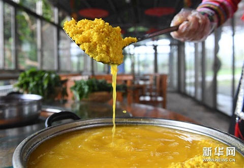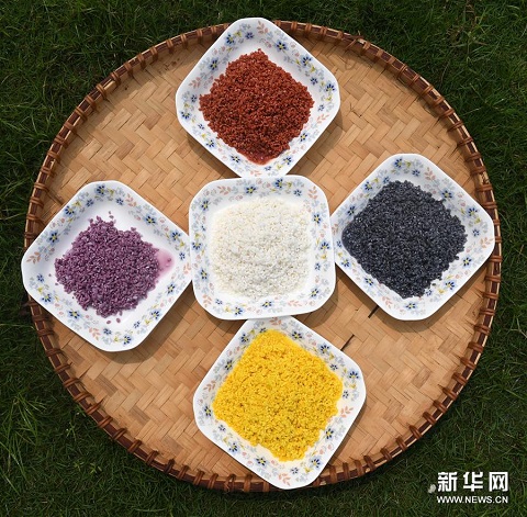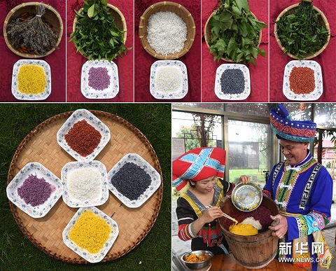 上五圖:4種不同植物及其色素染成的糯米和原色糯米;下左圖:4種不同植物色素染成的糯米和原色糯米;下右圖:在廣西上林縣巷賢鎮(zhèn),兩名壯族村民在查看一桶剛剛蒸熟的五色糯米飯(拼版圖片,3月25日攝)。 每年“壯族三月三”到來(lái)之際,廣西的壯族同胞都有蒸制五色糯米飯迎接節(jié)日的習(xí)俗,以祈禱五谷豐登,五福臨門(mén)。這些五色糯米飯,主要采用天然植物萃取色素,將糯米分別浸泡到紫、黃、紅、黑4種不同植物色素的水里,充分染色后,與原色糯米一起蒸熟而成。色澤鮮艷、清香誘人的五色糯米飯,是“壯族三月三”接待來(lái)客時(shí)必不可少的傳統(tǒng)美食。新華社記者 陸波岸 攝