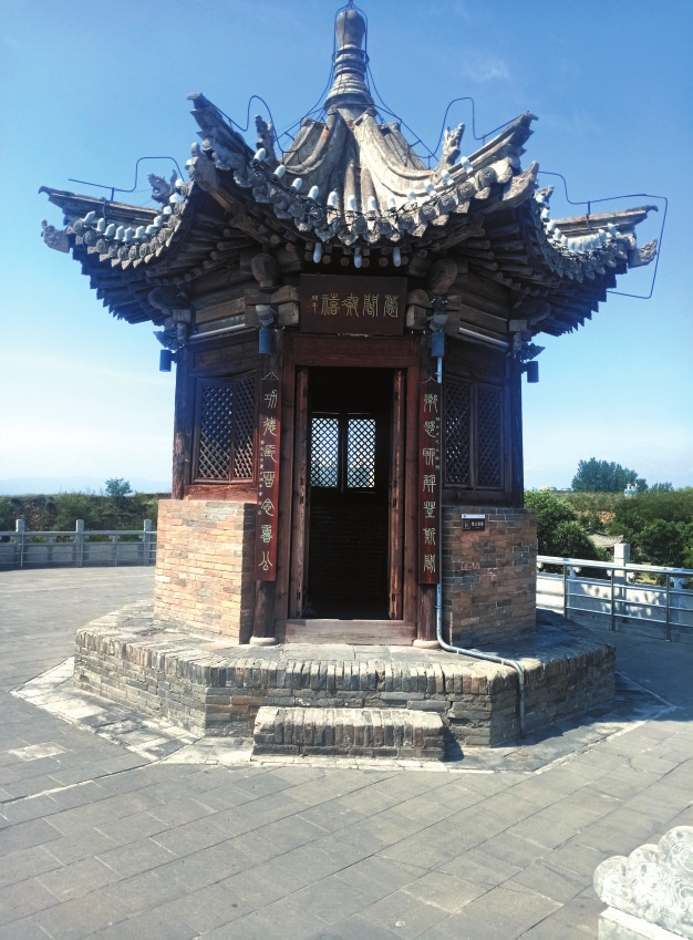 從魁星閣經(jīng)過百余米磚路,登逐步高升的石階,就到西岡最高處“廖天閣”了。廖天閣,又名六角亭,現(xiàn)存建筑建于清雍正三年(1725年),建筑形制為木構(gòu)六角攢尖頂,孔雀綠琉璃瓦覆蓋,建筑面積約32.6平方米,高約8.3米,每邊長約3.5米。閣由五柱支撐,閣窗由五個(gè)對(duì)扇窗戶組成,整體看上去結(jié)構(gòu)精巧,清雅俊秀,古樸蒼重,六角欲飛,別具洞天,與天上低低的云海相接,故名“廖天閣”。閣門向東南方向敞開,門兩邊有當(dāng)代書法家寫就的楹聯(lián):一亭錦繡托青云直上,六角崢嶸迎鴻雁南來。橫批:德優(yōu)懷遠(yuǎn)。