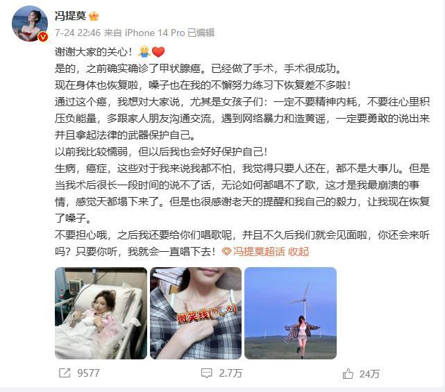 前不久,歌手馮提莫在微博發(fā)文稱(chēng)自己患甲狀腺癌,經(jīng)手術(shù)已恢復(fù)。她說(shuō),通過(guò)這個(gè)癌,想對(duì)大家說(shuō),尤其是女孩子們,一定不要精神內(nèi)耗,不要往心里積壓負(fù)能量。