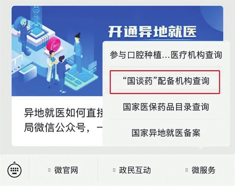 第一步:進(jìn)入“國(guó)家醫(yī)保局”微信公眾號(hào),點(diǎn)擊微服務(wù)→“國(guó)談藥”配備機(jī)構(gòu)查詢,進(jìn)入查詢頁(yè)面。