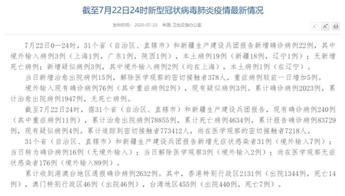 人民網(wǎng)北京7月23日電(董童)國家衛(wèi)生健康委于今日在官網(wǎng)發(fā)布的《截至7月22日24時(shí)新型冠狀病毒肺炎疫情最新情況》(以下簡稱“情況”)提出,7月22日0—24時(shí),31個(gè)?。ㄗ灾螀^(qū)、直轄市)和新疆生產(chǎn)建設(shè)兵團(tuán)報(bào)告新增確診病例22例,其中境外輸入病例3例(上海1例,廣東1例,陜西1例),本土病例19例(新疆18例,遼寧1例);無新增死亡病例;新增疑似病例3例,其中境外輸入病例2例(均在上海),本土病例1例(在遼寧)。當(dāng)日新增治愈出院病例15例,解除醫(yī)學(xué)觀察的密切接觸者378人,重癥病例較前一日增加5例。