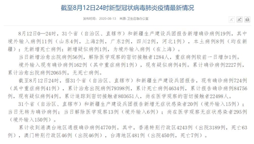 人民網(wǎng)北京8月13日電(董童)國(guó)家衛(wèi)生健康委于今日在官網(wǎng)發(fā)布的《截至8月12日24時(shí)新型冠狀病毒肺炎疫情最新情況》(以下簡(jiǎn)稱“情況”)提出,8月12日0—24時(shí),31個(gè)?。ㄗ灾螀^(qū)、直轄市)和新疆生產(chǎn)建設(shè)兵團(tuán)報(bào)告新增確診病例19例,其中境外輸入病例11例(山東4例,上海2例,廣東2例,四川2例,河北1例),本土病例8例(均在新疆);無新增死亡病例;新增疑似病例1例,為境外輸入病例(在上海)。當(dāng)日新增治愈出院病例56例,解除醫(yī)學(xué)觀察的密切接觸者1284人,重癥病例較前一日增加1例。