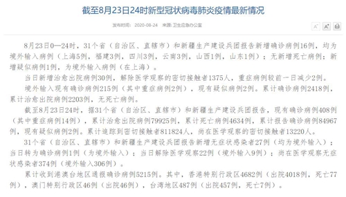 情況顯示,截至8月23日24時(shí),據(jù)31個(gè)?。ㄗ灾螀^(qū)、直轄市)和新疆生產(chǎn)建設(shè)兵團(tuán)報(bào)告,現(xiàn)有確診病例408例(其中重癥病例14例),累計(jì)治愈出院病例79925例,累計(jì)死亡病例4634例,累計(jì)報(bào)告確診病例84967例,現(xiàn)有疑似病例2例。累計(jì)追蹤到密切接觸者811824人,尚在醫(yī)學(xué)觀察的密切接觸者13220人。