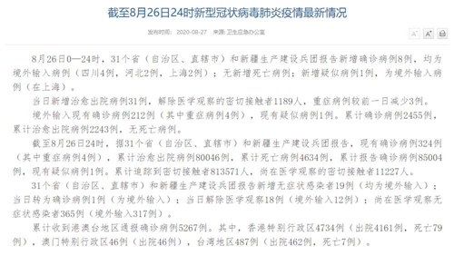 情況顯示,截至8月26日24時,據(jù)31個省(自治區(qū)、直轄市)和新疆生產(chǎn)建設(shè)兵團(tuán)報告,現(xiàn)有確診病例324例(其中重癥病例4例),累計治愈出院病例80046例,累計死亡病例4634例,累計報告確診病例85004例,現(xiàn)有疑似病例1例。累計追蹤到密切接觸者813571人,尚在醫(yī)學(xué)觀察的密切接觸者11227人。