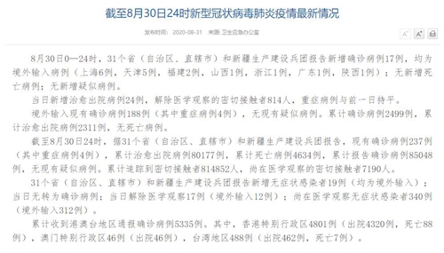 情況顯示,截至8月30日24時(shí),據(jù)31個省(自治區(qū)、直轄市)和新疆生產(chǎn)建設(shè)兵團(tuán)報(bào)告,現(xiàn)有確診病例237例(其中重癥病例4例),累計(jì)治愈出院病例80177例,累計(jì)死亡病例4634例,累計(jì)報(bào)告確診病例85048例,無現(xiàn)有疑似病例。累計(jì)追蹤到密切接觸者814852人,尚在醫(yī)學(xué)觀察的密切接觸者7190人。