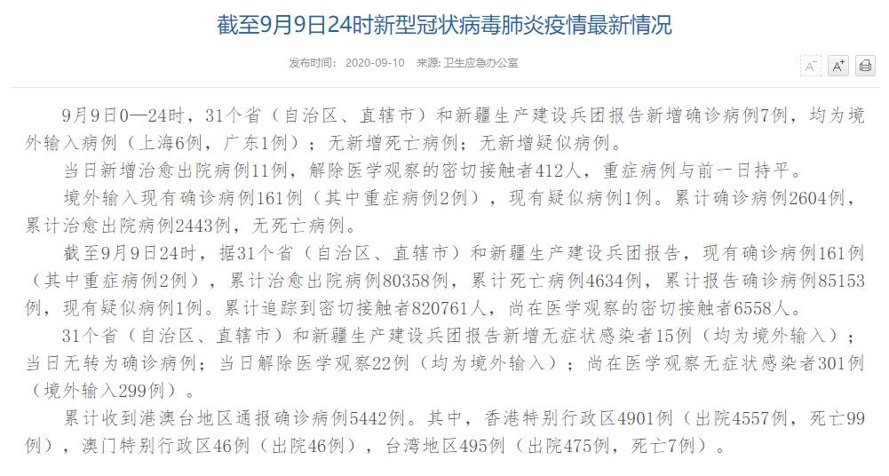 人民網(wǎng)北京9月10日電(董童)國家衛(wèi)生健康委于今日在官網(wǎng)發(fā)布的《截至9月9日24時新型冠狀病毒肺炎疫情最新情況》(以下簡稱“情況”)提出,9月9日0—24時,31個?。ㄗ灾螀^(qū)、直轄市)和新疆生產(chǎn)建設兵團報告新增確診病例7例,均為境外輸入病例(上海6例,廣東1例);無新增死亡病例;無新增疑似病例。當日新增治愈出院病例11例,解除醫(yī)學觀察的密切接觸者412人,重癥病例與前一日持平。