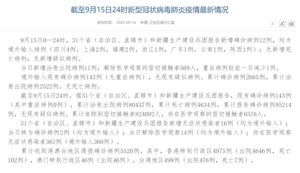 人民網北京9月16日電(董童)國家衛(wèi)生健康委于今日在官網發(fā)布的《截至9月15日24時新型冠狀病毒肺炎疫情最新情況》(以下簡稱“情況”)提出,9月15日0—24時,31個?。ㄗ灾螀^(qū)、直轄市)和新疆生產建設兵團報告新增確診病例12例,均為境外輸入病例(四川4例,上海2例,福建2例,浙江1例,廣東1例,云南1例,陜西1例);無新增死亡病例;無新增疑似病例。當日新增治愈出院病例11例,解除醫(yī)學觀察的密切接觸者569人,重癥病例較前一日減少1例。