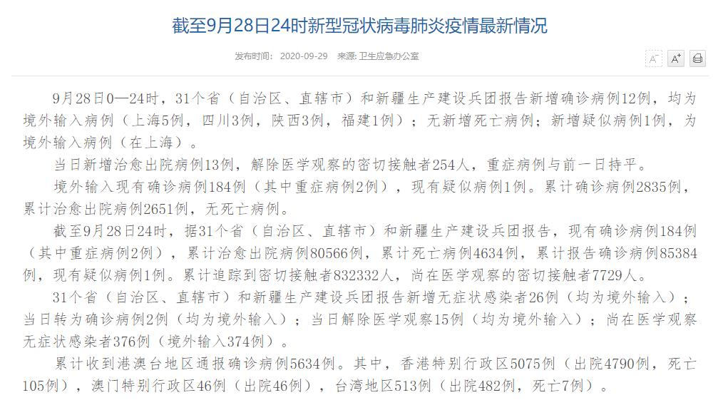 人民網(wǎng)北京9月29日電(董童)國(guó)家衛(wèi)生健康委于今日在官網(wǎng)發(fā)布的《截至9月28日24時(shí)新型冠狀病毒肺炎疫情最新情況》(以下簡(jiǎn)稱(chēng)“情況”)提出,9月28日0—24時(shí),31個(gè)?。ㄗ灾螀^(qū)、直轄市)和新疆生產(chǎn)建設(shè)兵團(tuán)報(bào)告新增確診病例12例,均為境外輸入病例(上海5例,四川3例,陜西3例,福建1例);無(wú)新增死亡病例;新增疑似病例1例,為境外輸入病例(在上海)。當(dāng)日新增治愈出院病例13例,解除醫(yī)學(xué)觀察的密切接觸者254人,重癥病例與前一日持平。