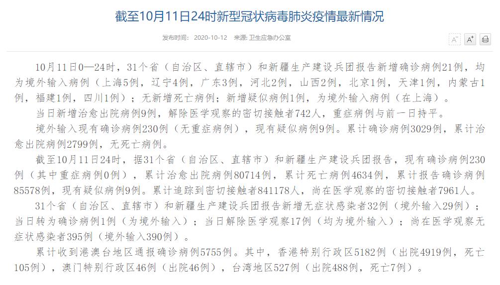 | 國家衛(wèi)健委:10月11日新增確診病例21例 均為境外輸入病例 |