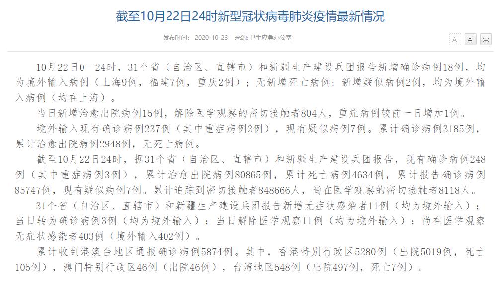 人民網(wǎng)北京10月23日電(董童)國家衛(wèi)生健康委于今日在官網(wǎng)發(fā)布的《截至10月22日24時新型冠狀病毒肺炎疫情最新情況》(以下簡稱“情況”)提出,10月22日0—24時,31個?。ㄗ灾螀^(qū)、直轄市)和新疆生產(chǎn)建設(shè)兵團報告新增確診病例18例,均為境外輸入病例(上海9例,福建7例,重慶2例);無新增死亡病例;新增疑似病例2例,均為境外輸入病例(均在上海)。當(dāng)日新增治愈出院病例15例,解除醫(yī)學(xué)觀察的密切接觸者804人,重癥病例較前一日增加1例。