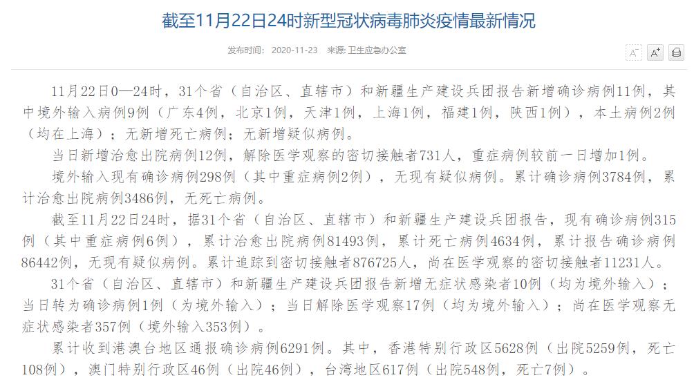 人民網(wǎng)北京11月23日電(董童)國家衛(wèi)生健康委于今日在官網(wǎng)發(fā)布的《截至11月22日24時新型冠狀病毒肺炎疫情最新情況》(以下簡稱“情況”)指出,11月22日0—24時,31個?。ㄗ灾螀^(qū)、直轄市)和新疆生產(chǎn)建設(shè)兵團(tuán)報告新增確診病例11例,其中境外輸入病例9例(廣東4例,北京1例,天津1例,上海1例,福建1例,陜西1例),本土病例2例(均在上海);無新增死亡病例;無新增疑似病例。當(dāng)日新增治愈出院病例12例,解除醫(yī)學(xué)觀察的密切接觸者731人,重癥病例較前一日增加1例。