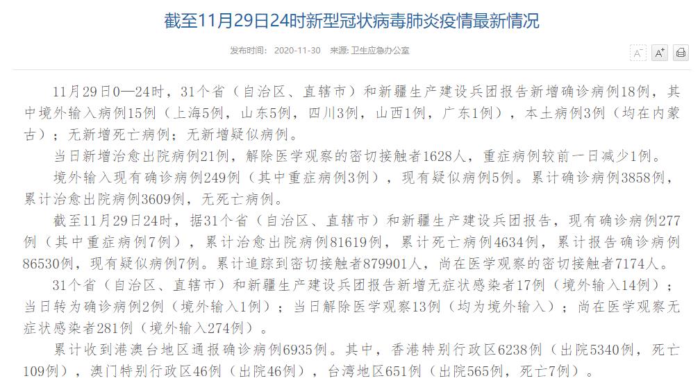 人民網(wǎng)北京11月30日電(董童)國家衛(wèi)生健康委于今日在官網(wǎng)發(fā)布的《截至11月29日24時新型冠狀病毒肺炎疫情最新情況》(以下簡稱“情況”)指出,11月29日0—24時,31個省(自治區(qū)、直轄市)和新疆生產(chǎn)建設(shè)兵團報告新增確診病例18例,其中境外輸入病例15例(上海5例,山東5例,四川3例,山西1例,廣東1例),本土病例3例(均在內(nèi)蒙古);無新增死亡病例;無新增疑似病例。當日新增治愈出院病例21例,解除醫(yī)學(xué)觀察的密切接觸者1628人,重癥病例較前一日減少1例。