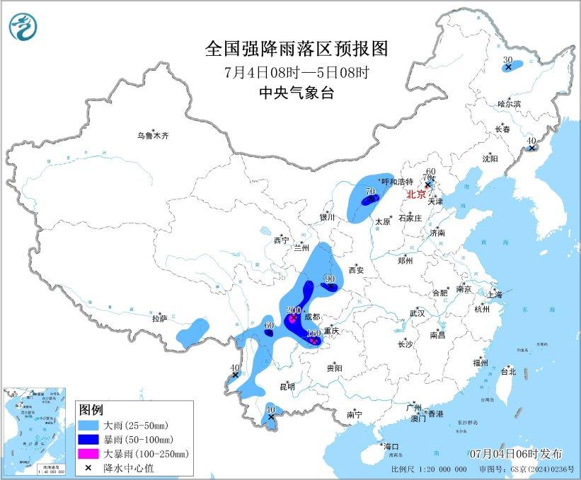 預(yù)計(jì),7月4日8時(shí)至5日8時(shí),內(nèi)蒙古河套地區(qū)、甘肅東部、寧夏南部、陜西北部和西南部、山西北部、四川盆地西部和南部、云南西部、西藏東部等地部分地區(qū)有大到暴雨,其中,四川盆地西部和南部等地局地有大暴雨(100~200毫米)。上述部分地區(qū)伴有短時(shí)強(qiáng)降水(最大小時(shí)降雨量20~50毫米,局地可超過70毫米),局地有雷暴大風(fēng)等強(qiáng)對(duì)流天氣。