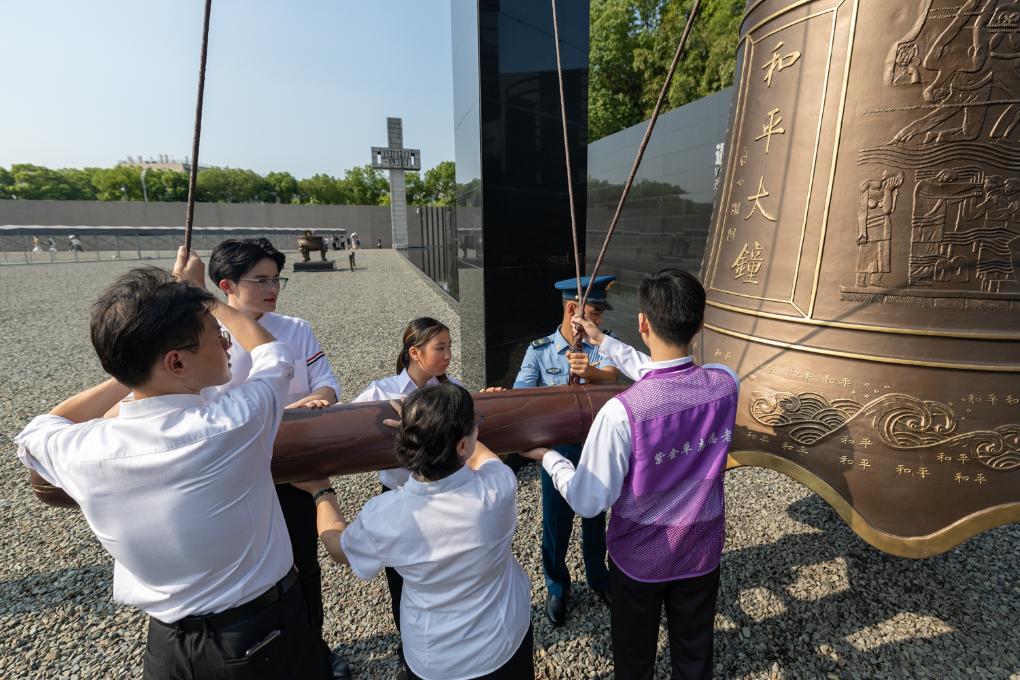 7月7日,各界人士代表在“紀念全民族抗戰(zhàn)爆發(fā)88周年”儀式現(xiàn)場撞響和平大鐘。新華社發(fā)(胡瀟攝)