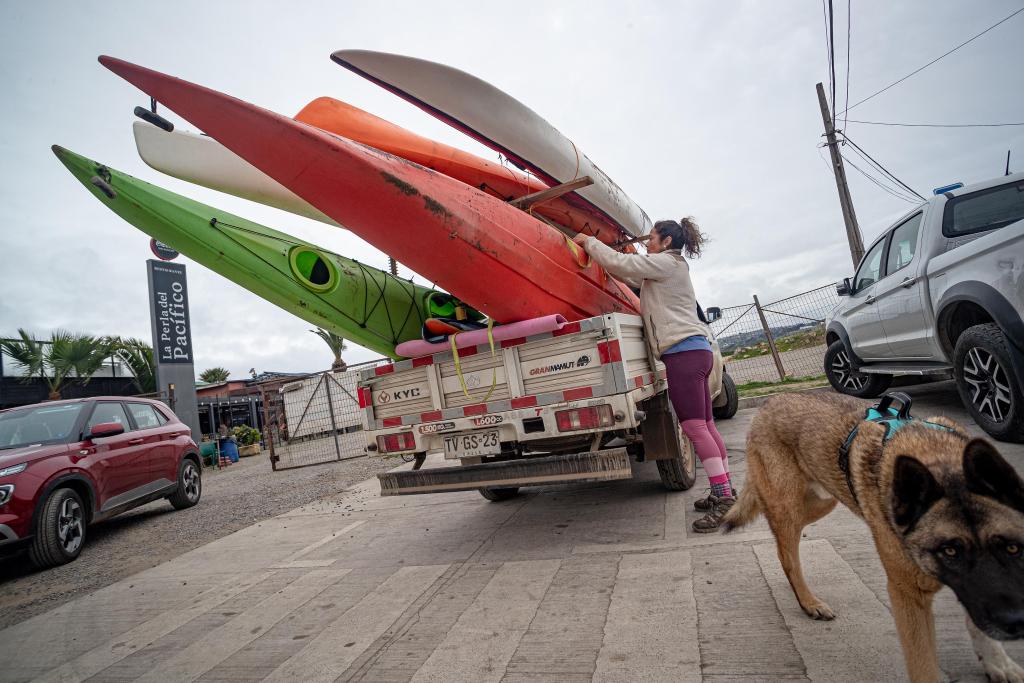 7月30日,在智利瓦爾帕萊索大區(qū)康孔市,一名女士準(zhǔn)備向安全地帶撤離。新華社發(fā)