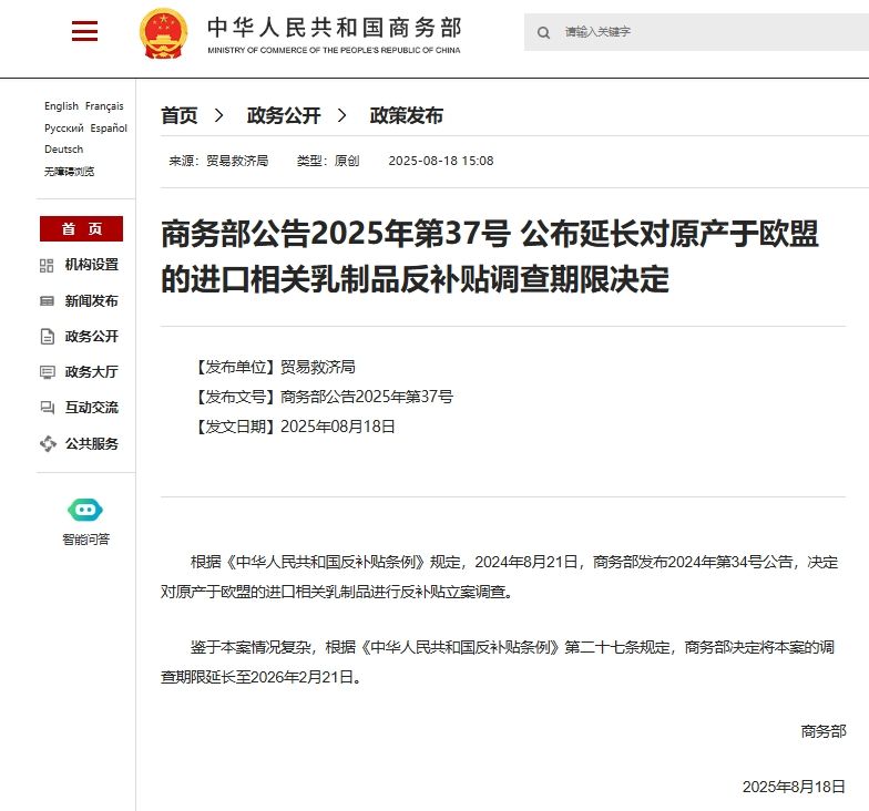 商務(wù)部公告2025年第37號 公布延長對原產(chǎn)于歐盟的進(jìn)口相關(guān)乳制品反補貼調(diào)查期限決定