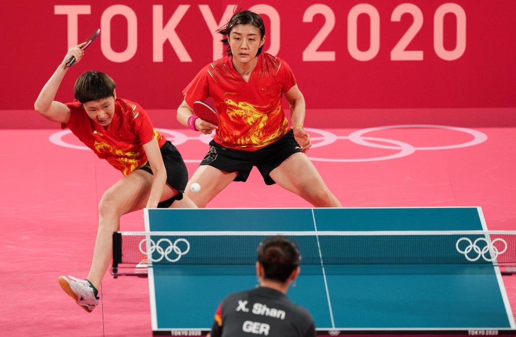 8月4日,中國(guó)隊(duì)組合王曼昱(左)/陳夢(mèng)在比賽中。新華社記者劉大偉攝