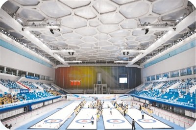 國(guó)家游泳中心奧林匹克比賽大廳的冰壺賽道。新華社記者 張晨霖?cái)z