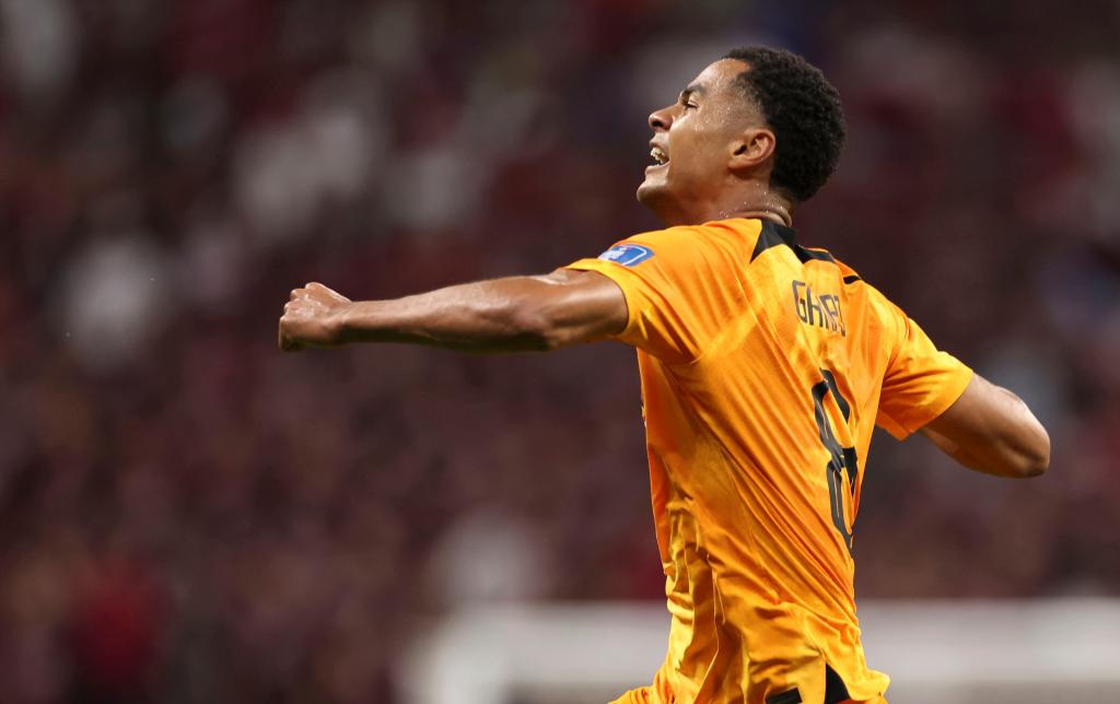 11月29日,荷蘭隊球員科迪·加克波在比賽中進球后慶祝。新華社記者 徐子鑒 攝