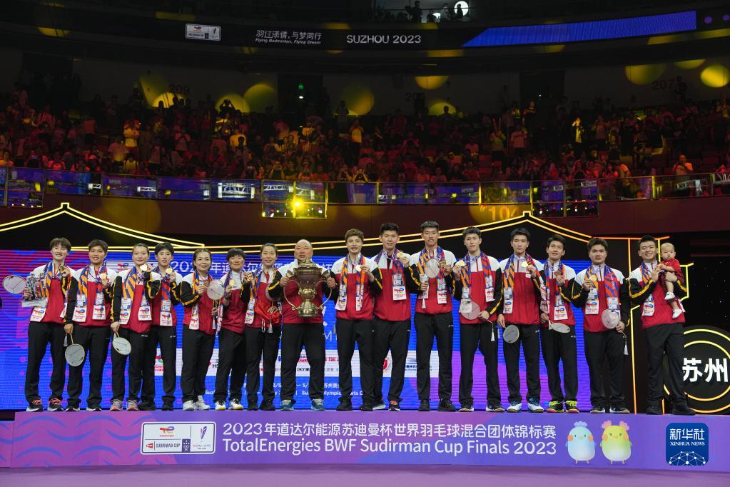 5月21日,2023年蘇迪曼杯世界羽毛球混合團體錦標(biāo)賽頒獎儀式在江蘇省蘇州市舉行。中國隊在決賽中以3比0戰(zhàn)勝韓國隊,奪得冠軍。圖為中國隊在頒獎儀式上慶祝。新華社記者 杜宇 攝