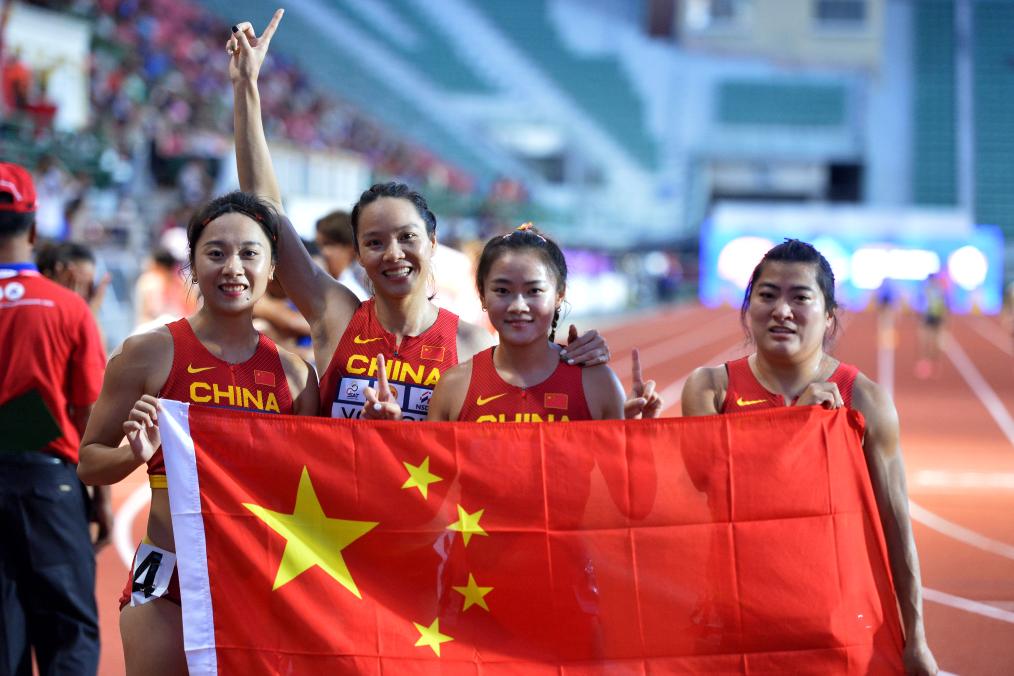 7月12日,中國隊選手葛曼棋、韋永麗、梁小靜和袁琦琦(從左至右)在女子4×100米接力決賽后合影。新華社發(fā)(拉亨攝)