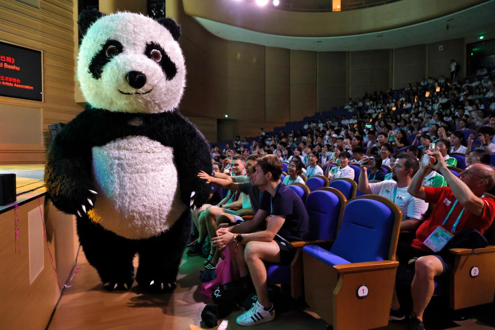 8月2日,一名演員裝扮成大熊貓?jiān)谘莩鲩g隙與觀眾互動(dòng)。當(dāng)日,“奇幻之夜”雜技魔術(shù)晚會(huì)在成都大運(yùn)村藝術(shù)中心大劇場(chǎng)舉行。本場(chǎng)活動(dòng)是在大運(yùn)村舉辦的“Be Together”主題系列晚會(huì)之一。新華社記者沈伯韓攝