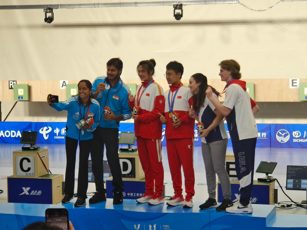 當(dāng)天,射擊賽場(chǎng)的頒獎(jiǎng)儀式現(xiàn)場(chǎng)變成了全場(chǎng)一起慶生的歡樂景象。在10米氣步槍混合團(tuán)體項(xiàng)目獲得銀牌的印度姑娘瓦拉里萬站在領(lǐng)獎(jiǎng)臺(tái)上,在“生日快樂”的祝福聲中,伴著現(xiàn)場(chǎng)觀眾的掌聲,與一同參加頒獎(jiǎng)儀式的中國(guó)、美國(guó)選手們拍照留念。