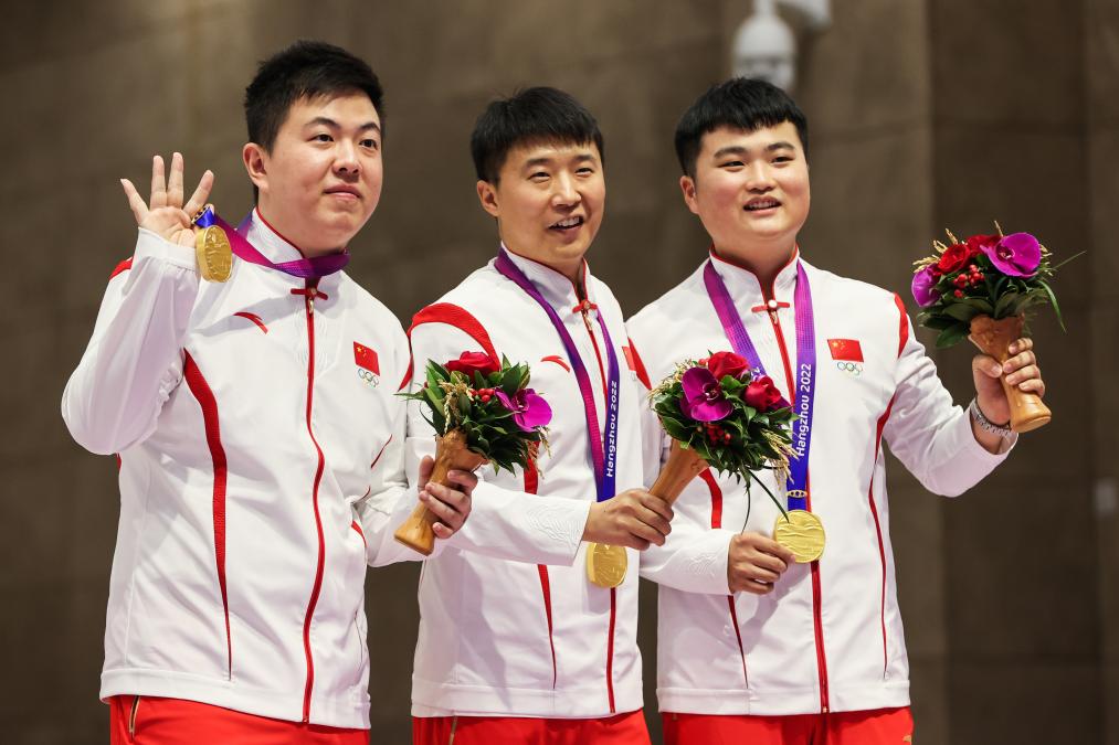 9月25日,男子25米手槍速射爭奪中,王鑫杰、劉楊攀、李越宏組成的中國隊以1765環(huán)的破世界紀(jì)錄成績奪得團體冠軍。