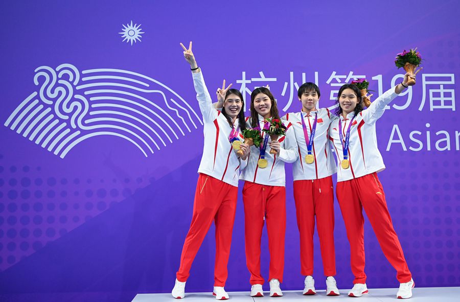 9月24日,女子4x100米自由泳接力決賽,由楊?,u、程玉潔、吳卿風(fēng)和張雨霏組成的中國隊優(yōu)勢明顯,最終以3分33秒96破賽會紀(jì)錄的成績奪得冠軍。
