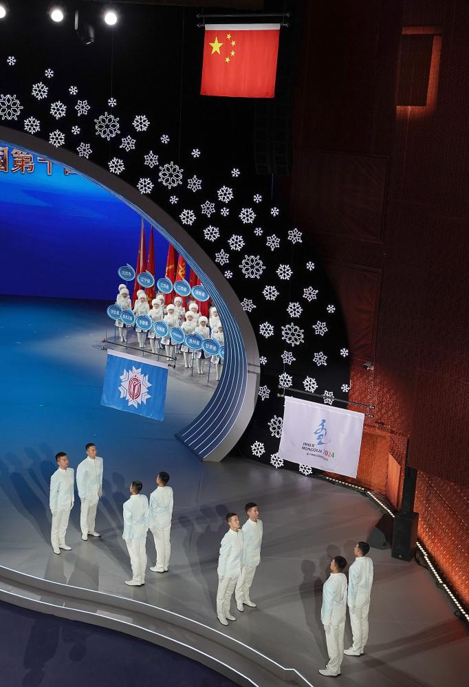 第十四屆全國冬季運動會組委會副主任、國家體育總局副局長周進強宣讀關(guān)于授予中華人民共和國第十四屆冬季運動會參賽代表團體育道德風尚獎和參賽紀念獎的決定。隨后,國家體育總局向“十四冬”承辦地內(nèi)蒙古自治區(qū)贈送紀念品。