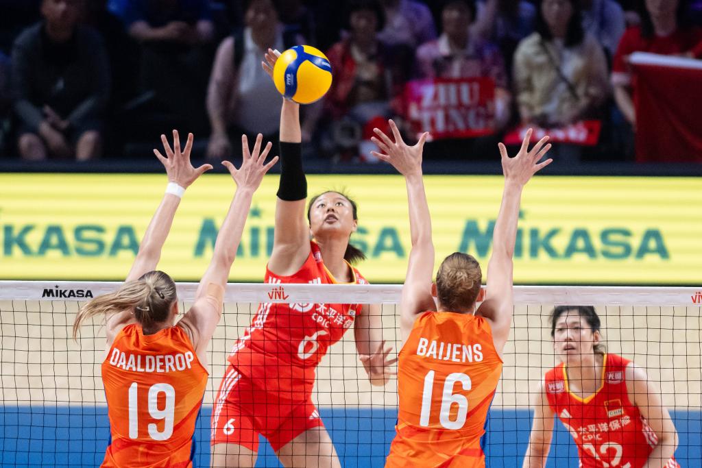 闊別國家隊已久的朱婷在賽點時替補上陣,贏得全場觀眾歡呼。這是她自2021年夏天舉行的東京奧運會后,再次代表中國女排出戰(zhàn)。