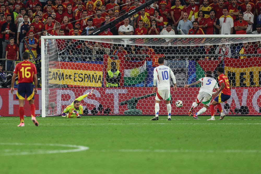 下半場(chǎng)西班牙隊(duì)延續(xù)攻勢(shì),威廉姆斯繼續(xù)成為球隊(duì)爆點(diǎn),與他對(duì)位的意大利隊(duì)邊后衛(wèi)迪洛倫佐苦不堪言。第55分鐘,威廉姆斯邊路傳中,莫拉塔前點(diǎn)頭球攻門被唐納魯馬單掌撲出,但意大利隊(duì)后衛(wèi)卡拉菲奧里避閃不及自擺烏龍,“斗牛士”軍團(tuán)1:0領(lǐng)先。