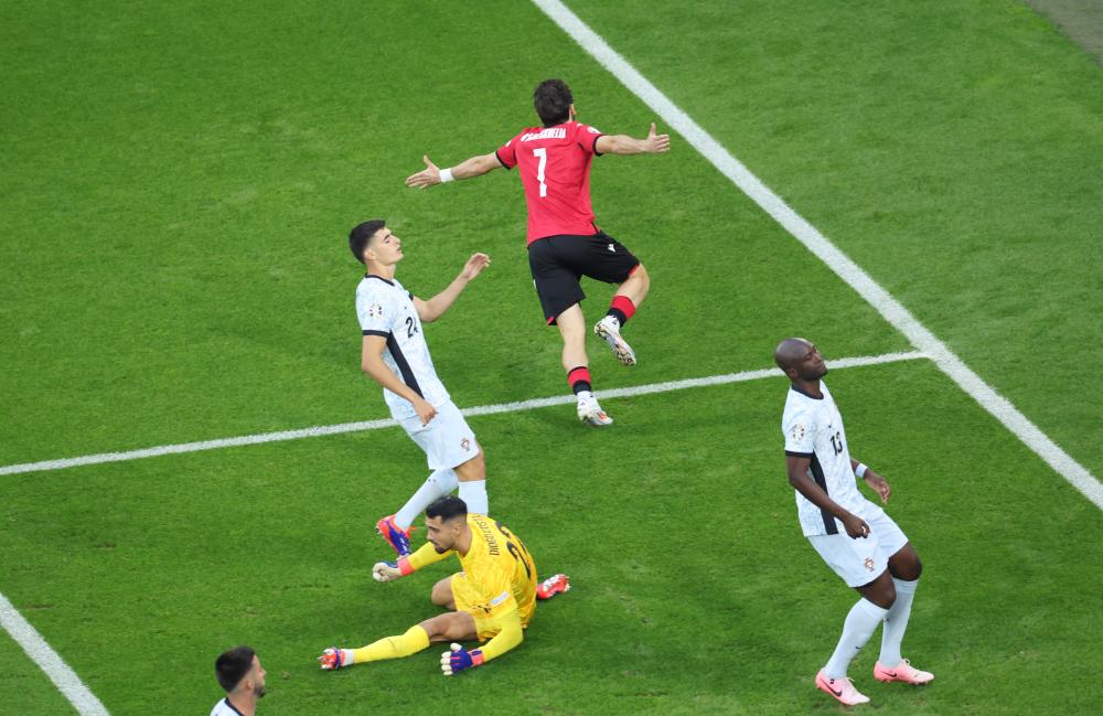 6月26日,格魯吉亞隊(duì)球員克瓦拉茨赫利亞(上)慶祝進(jìn)球。當(dāng)日,在德國(guó)蓋爾森基興進(jìn)行的2024歐洲足球錦標(biāo)賽F組第三輪比賽中,葡萄牙隊(duì)0比2不敵格魯吉亞隊(duì)。新華社記者 白雪飛 攝