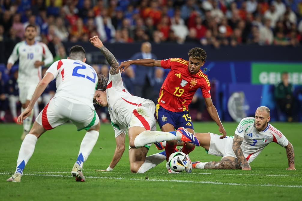 6月20日,西班牙隊(duì)球員亞馬爾(右二)在比賽中帶球突破。當(dāng)日,在德國(guó)蓋爾森基興進(jìn)行的2024歐洲足球錦標(biāo)賽B組次輪比賽中,西班牙隊(duì)1比0戰(zhàn)勝意大利隊(duì)。新華社記者 潘昱龍 攝