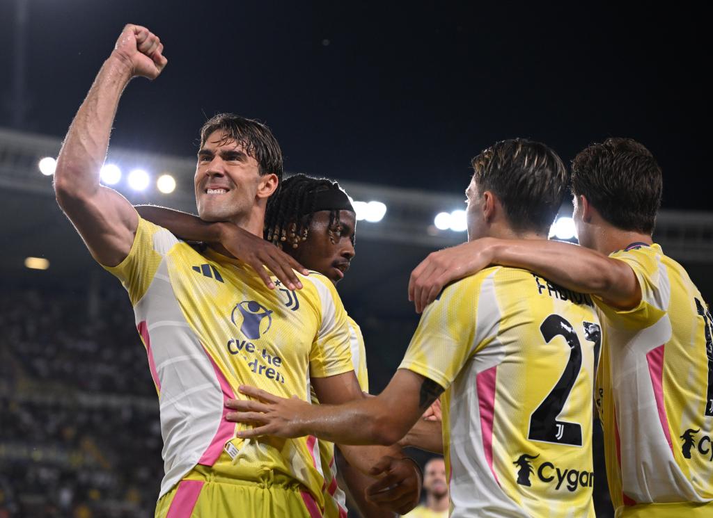 8月26日,尤文圖斯隊球員弗拉霍維奇(左)與隊友慶祝本場第二粒進球。新華社發(fā)(阿爾貝托·林格利亞攝)