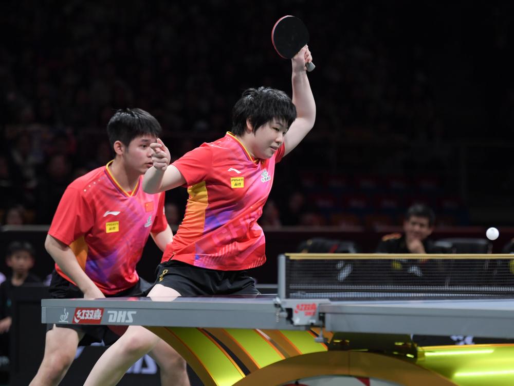 12月4日,中國隊(duì)組合林詩棟/蒯曼(右)在混雙比賽中。新華社記者 王曦 攝